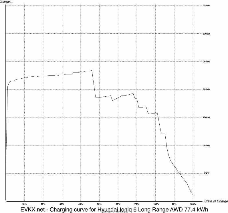 No hay que interpretar estos datos de forma errónea. A continuación puedes ver la curva de carga del Mercedes CLA 2025 y del Hyundai IONIQ 6 y podrás comprobar que, como te digo, la curva de carga del nuevo CLA es muy mejorable. Sí, es cierto que alcanza los 320 kW de potencia máxima, por supuesto, pero la caída es más fuerte y acelerada que la de modelos comparables como el Hyundai IONIQ 6. Este, de hecho, es capaz de mantener un rendimiento medio muy similar porque su potencia de carga cae menos, y de forma menos abrupta, aunque su máximo no es tan elevado.