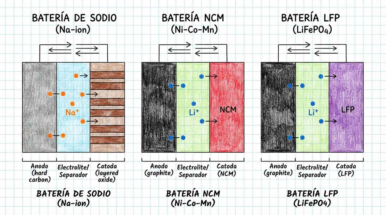 Las actuales baterías ternarias de litio comerciales; es decir, las NCM de vehículos eléctricos actuales, rondan los 280 a 300 Wh/kg, de modo que se demuestra que las baterías de sodio no solo sirven para aplicaciones de baja densidad energética, como sistemas de almacenamiento energético estacionario. El secreto detrás de este hallazgo está en una arquitectura concreta: cátodo de óxido laminar de alta energía y un diseño sin ánodo.