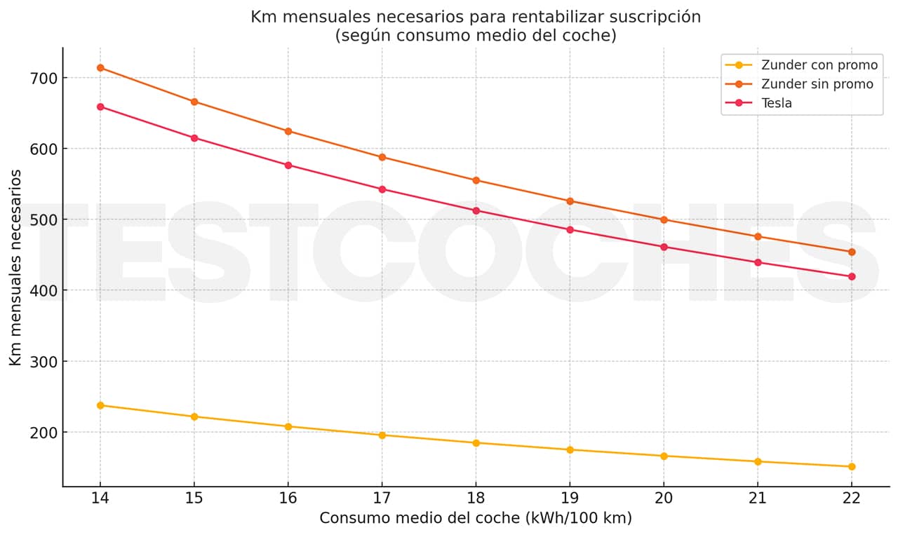 En la gráfica anterior puedes comprobar fácilmente que interesa más la suscripción, tanto de Zunder como de Tesla, cuanto más consuma nuestro coche eléctrico y cuantos más kilómetros recorramos. Si nuestro coche consume 14 kWh/100 km tendríamos que recorrer más kilómetros para que compense la cuota mensual; y si nuestro coche consume 22 kWh/100 km, sin embargo, con menos kilómetros ya estaremos compensando ese coste adicional de la cuota.
