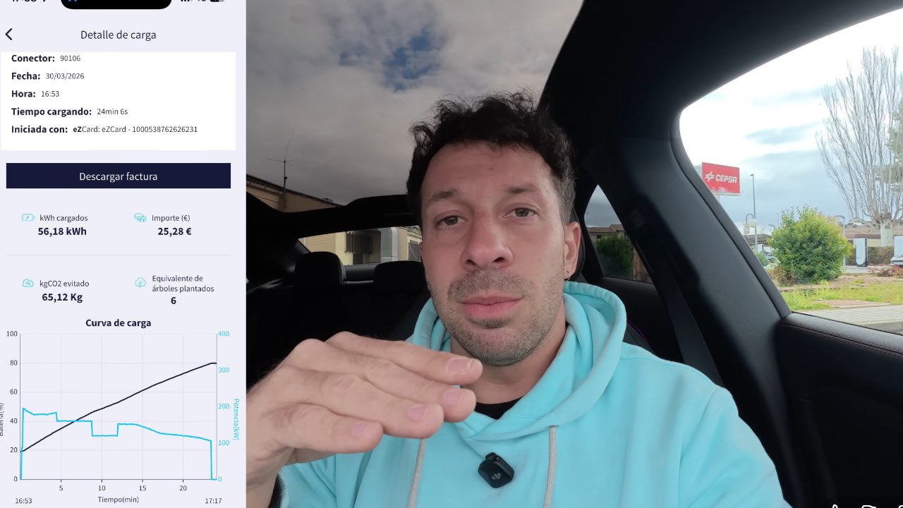 Lo primero es que la potencia máxima observada se quedó en torno a 137-138 kW, muy lejos de los 320 kW que anuncia Mercedes. Sin embargo, hay tres razones claras que explican este resultado. La primera es que la batería estaba fría, porque no activé el precalentamiento ni a través del navegador ni de forma manual. Lo hice a propósito: quería ver el rendimiento en condiciones desfavorables, que son las que muchos conductores van a encontrarse en el día a día sin pararse a planificar cuándo y dónde cargan. La segunda razón fue que el propio cargador, a pesar de ser de 360 kW, no entregaba toda la potencia por motivos que desconozco. Y la tercera es que empecé a cargar desde el 19%, un estado de carga demasiado alto como para ver los picos máximos del sistema. JCTaxiEléctrico, que cargó desde el 1%, llegó a ver 334-335 kW, confirmando que el coche sí alcanza esas cifras cuando las condiciones son óptimas y el cargador funciona correctamente..